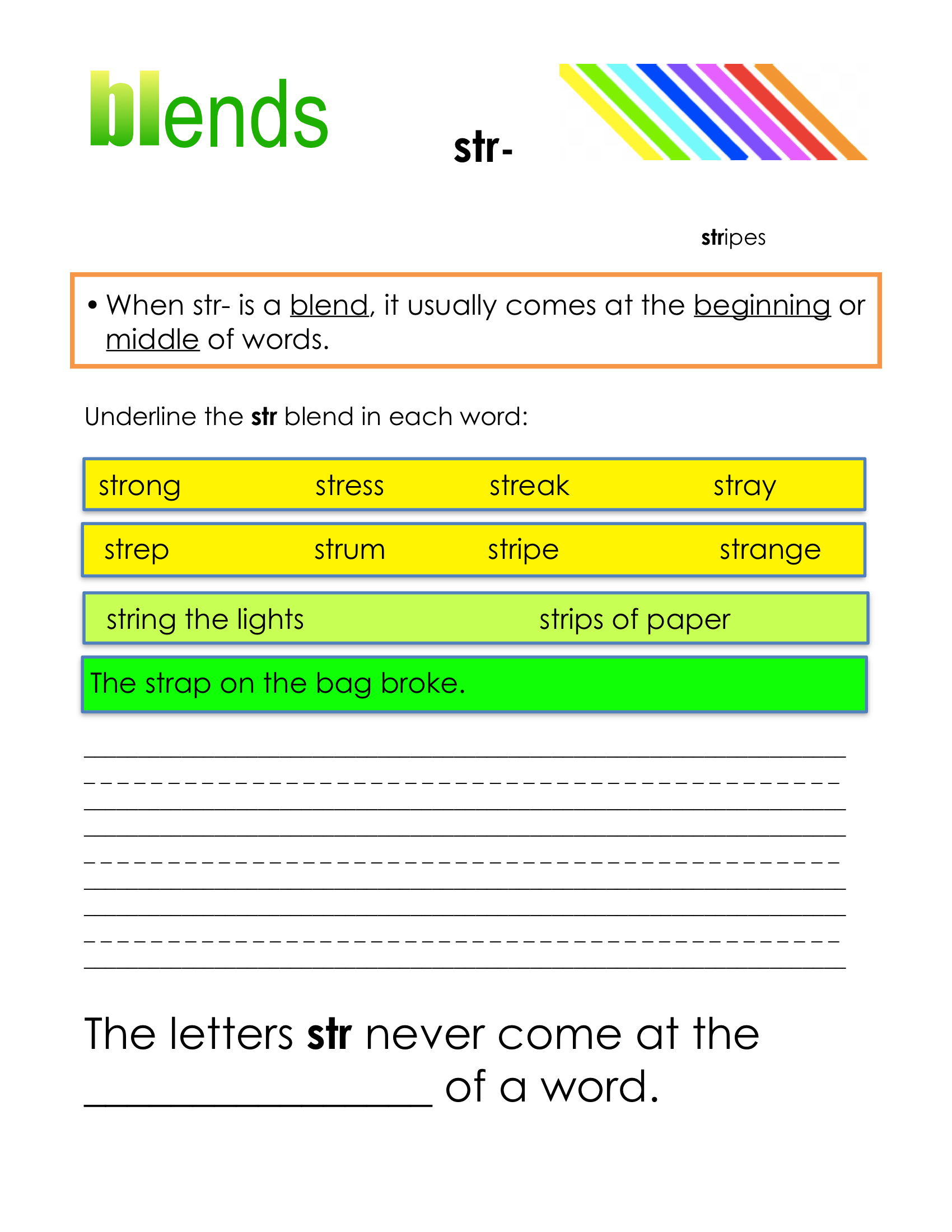This collection of reading worksheets provides 2 and 3 letter blends for beginning, middle and ending of the word. All letters in blends are audible and there is virtually every possible blend in this group. 47 pages.