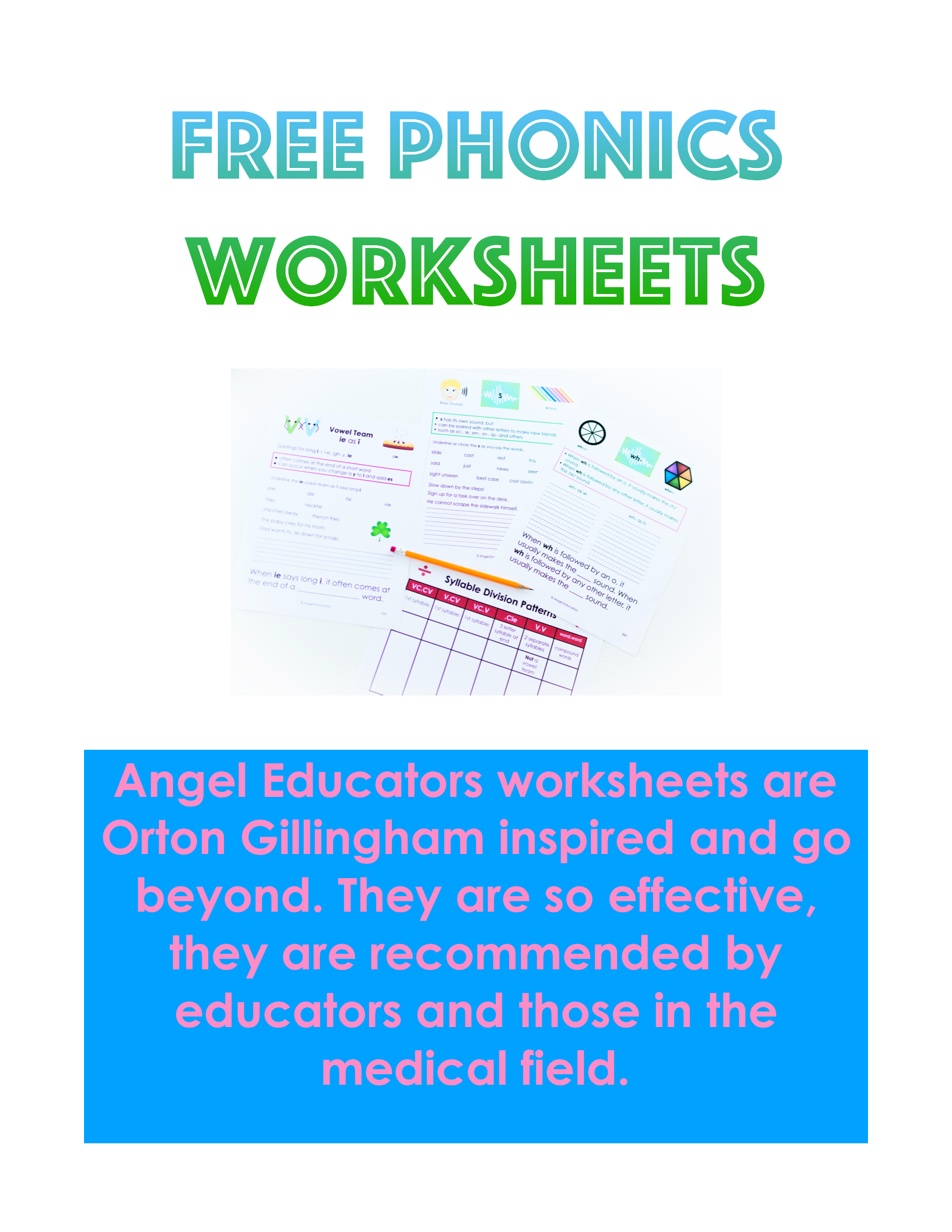 Discover the depth and incredible effectiveness of the Angel Educators: Orton Gillingham and Beyond worksheets. Help your class or your single student make great strides in reading, speaking and writing the English language.